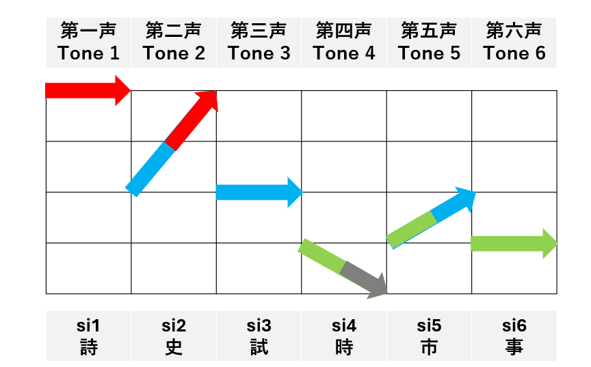 第六声(低平调):低音起始后逐渐升高,起始音调低,然后逐渐升高。
